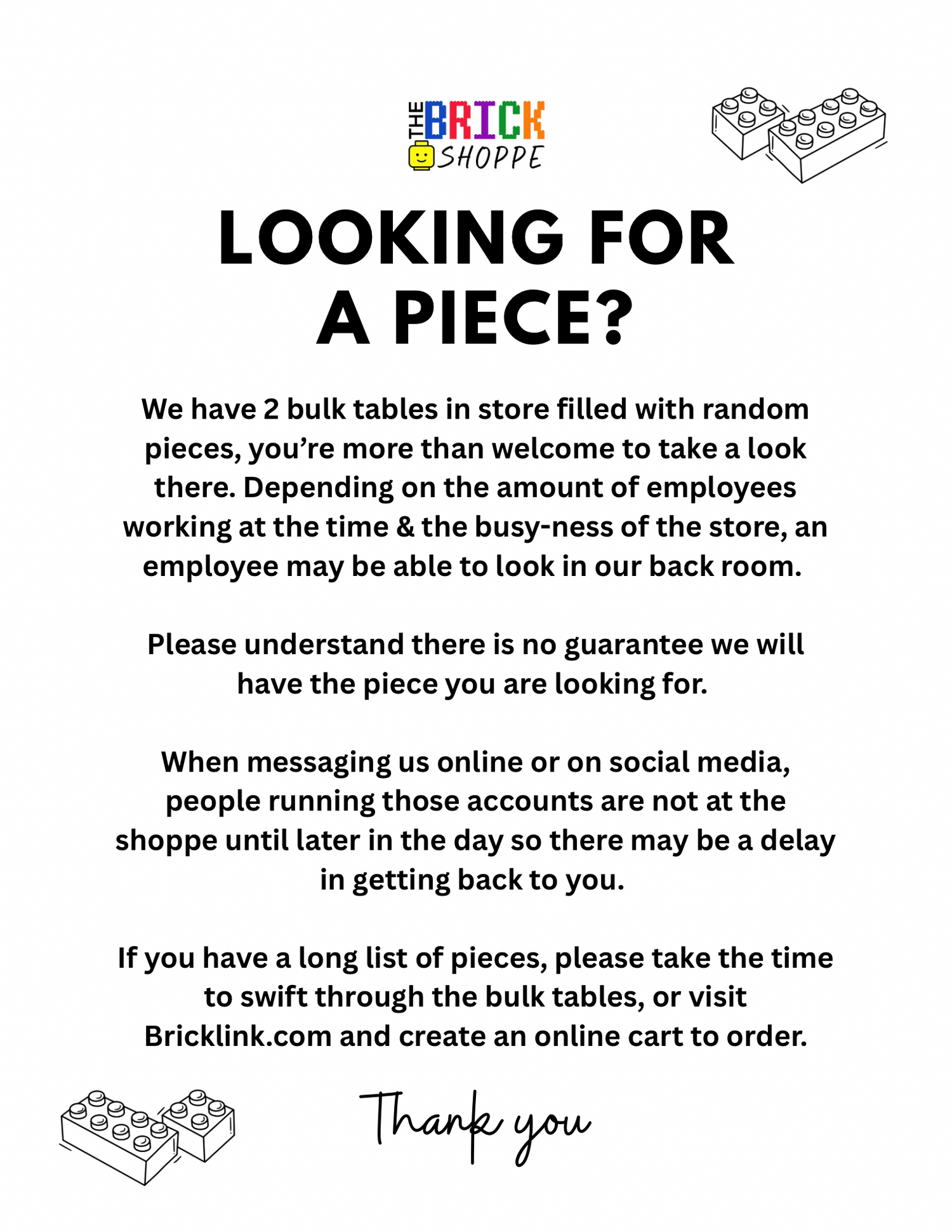 Dig through our Bulk Brick tables and pick out specific pieces to complete your own build, or search for a missing piece!